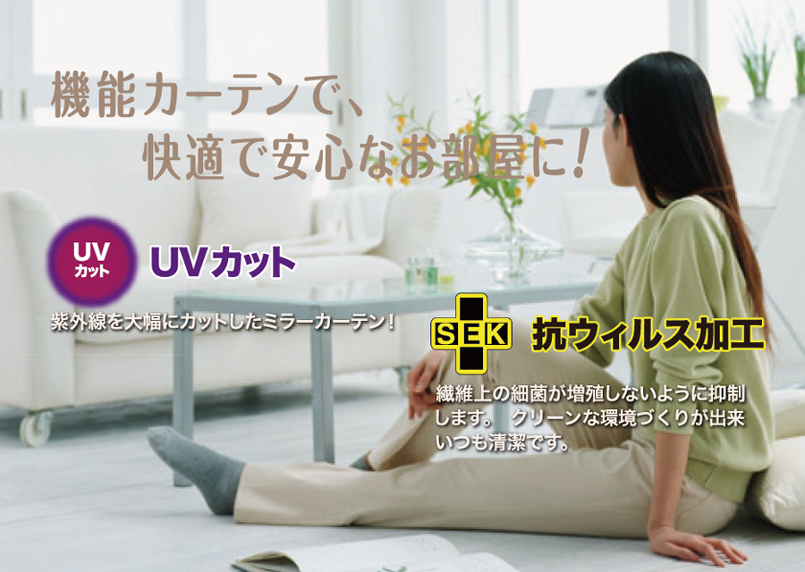 >イージーオーダーカーテン一覧はこちらから 高機能ミラーカーテン。透けにくくプライバシーをしっかりと守ってくれるミラーレースカーテン。カーテンを吊ることで窓とお部屋の間に空気の層ができるため、季節を問わず省エネ性能を発揮します。さらにSEK黒ラベルの抗ウィルス加工で、繊維上に付着した特定のウィルスの数を減少させて清潔に保ち、クリーンな環境づくりにも役立つレースカーテン。(1枚の価格です。両開きでご使用になる場合は2枚ご注文ください)組成:ポリエステル100%、ウォッシャブル、1.5倍ヒダ、アジャスターフック、UVカット、ミラーレース、抗ウィルス加工(SEK黒ラベル)・この商品は返品及び交換は承れません。・北海道、沖縄県及び離島地域は別途送料がかかります。・ご注文確定から約1週間程度で仕上がります(サイズ確認メール不要の場合、ご決済完了後すぐに手配に取り掛かります。サイズ確認メール必要の場合、お客様にメールをご確認頂いてからの手配となります)
