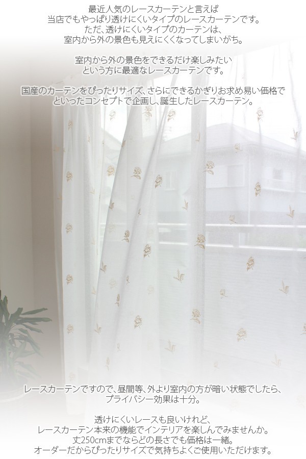 >既製カーテン一覧はこちらから >イージーオーダーカーテン一覧はこちらから 選択不可の品番は完売しました。 人気のレースカーテンと言えばやっぱり透けにくいタイプのレースカーテンですが、透けにくいタイプのカーテンは、室内から外の景色も見え難くなってしまいがち。室内から外の見通しは遮りたくないという方に最適なレースカーテンをオーダーで、しかもお求め易い価格で企画し誕生したオーダーレースカーテンです。レースカーテンですので、昼間等、外より室内の方が暗い状態でしたら、プライバシー効果は十分。丈250cmまでならどの長さでも価格は一緒です。(1枚の価格です。両開きでご使用になる場合は2枚ご注文ください。複数枚ご購入の場合、柄の位置があわない場合がございますので予めご了承くださいませ)組成:ポリエステル100%、ウォッシャブル、アジャスターフック、日本製、1.5倍ヒダ。・この商品は返品及び交換は承れません。・北海道、沖縄県及び離島地域は別途送料がかかります。・ご注文確定から約1週間程度で仕上がります(サイズ確認メール不要の場合、ご決済完了後すぐに手配に取り掛かります。サイズ確認メール必要の場合、お客様にメールをご確認頂いてからの手配となります)