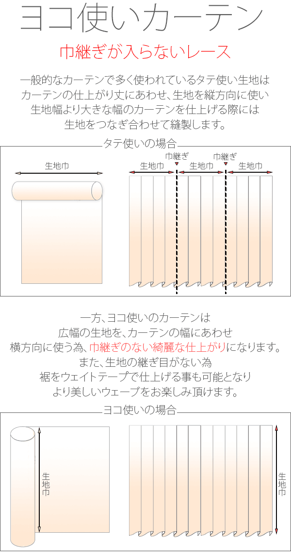 >既製カーテン一覧はこちらから >イージーオーダーカーテン一覧はこちらから 選択不可の品番は完売しました。人気のレースと言えばやっぱり透けにくいタイプのレースカーテンですが、透けにくいタイプのカーテンは、室内から外の景色も見え難くなってしまいがち。室内から外の見通しは遮りたくないという方に最適なレースカーテンをオーダーで、しかもお求め易い価格で企画し誕生したオーダーレースカーテンです。レースカーテンですので、昼間等、外より室内の方が暗い状態でしたら、プライバシー効果は十分。丈250cmまでならどの長さでも価格は一緒です。(1枚の価格です。両開きでご使用になる場合は2枚ご注文ください。複数枚ご購入の場合、柄の位置があわない場合がございますので予めご了承くださいませ)組成:ポリエステル100%、ウォッシャブル、アジャスターフック、日本製・この商品は返品及び交換は承れません。・北海道、沖縄県及び離島地域は別途送料がかかります。・ご注文確定から約1週間程度で仕上がります(サイズ確認メール不要の場合、ご決済完了後すぐに手配に取り掛かります。サイズ確認メール必要の場合、お客様にメールをご確認頂いてからの手配となります)