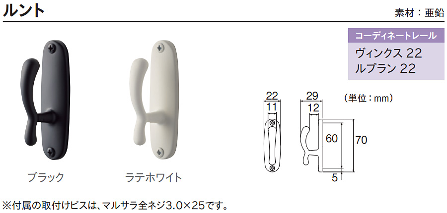 TOSOカーテンレールヴィンクス22、ルブラン22とコーディネイト可能なふさかけ。(素材:亜鉛)※付属の取付けビスは、マルサラ全ネジ3.0×25です。