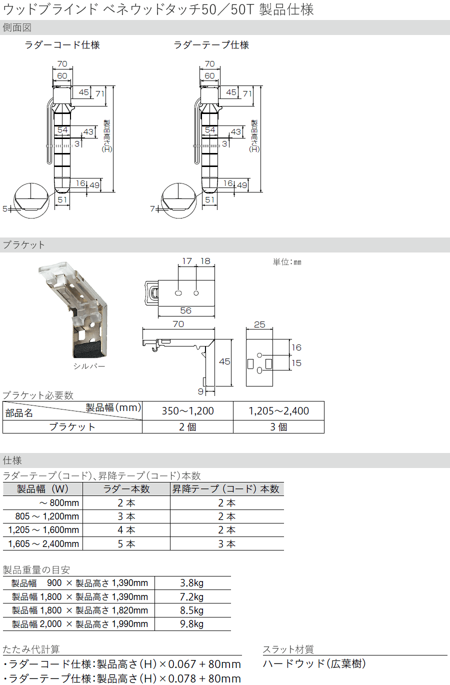 トーソー 木製ブラインド ベネウッドタッチ50 コルト(TM-4101〜TM-4116) スラット幅50mm 価格表 (税別価格 単位:円)